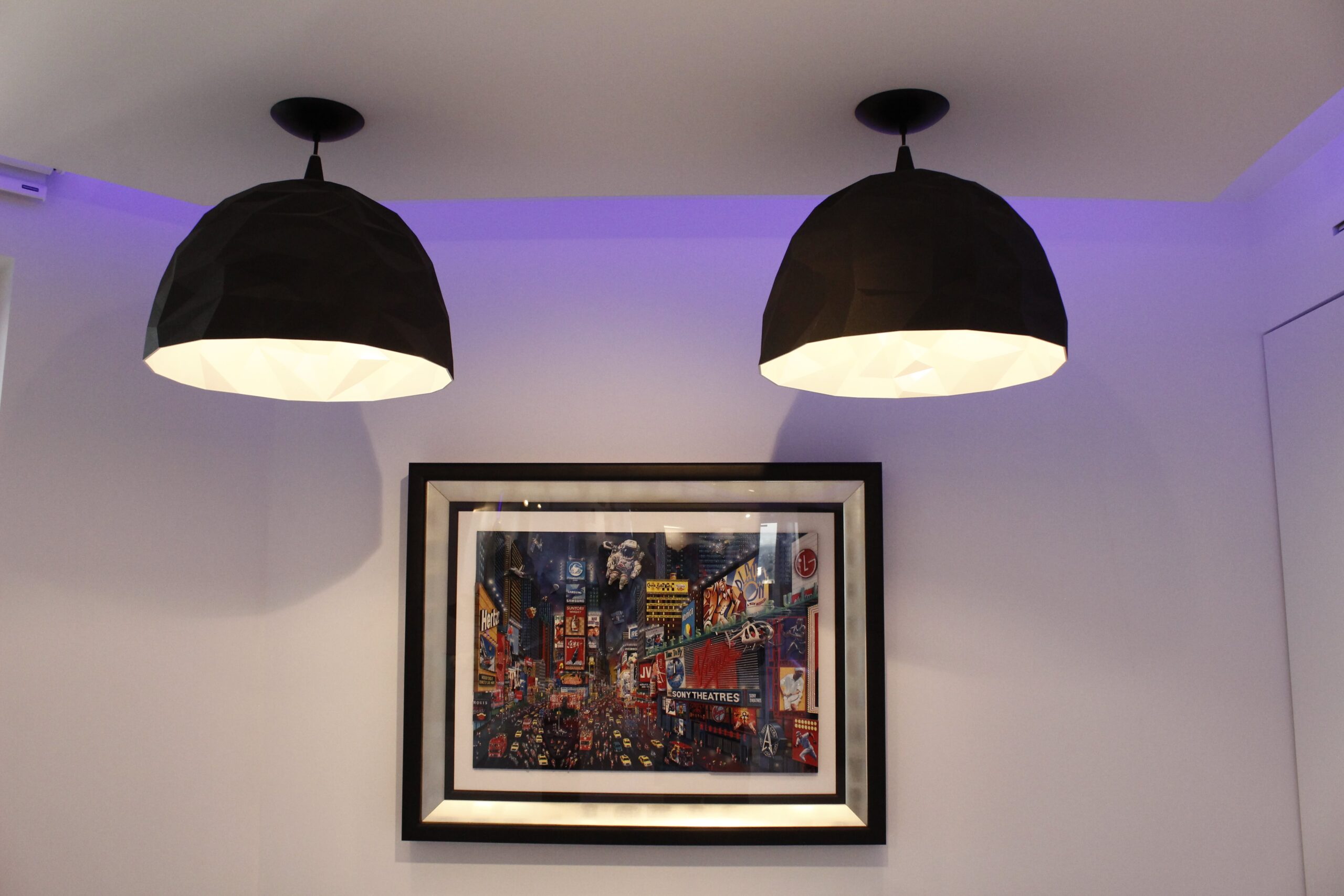 Designul interior modern, cu nuanța predominant albă, evidențiazăa foarte bine accentele de led RGB și liniile zvelte ale profilurilor luminoase care formează cadrele de trecere prin holuri.